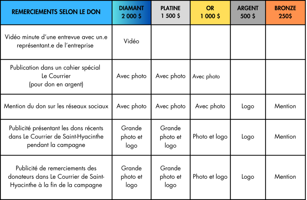 Pour participer, c’est très facile! Consultez le tableau ci-bas VISIBILITÉ OFFERTE SELON LE DON pour choisir le montant de votre don. Ensuite, vous n’avez qu’à remplir le formulaire simplifié.